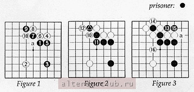Игра го. го в японии.В 12 веке класс воинов вытеснил аристократию, как эффективных правителей Японии, и до 17 века страна оказалась вовлечённой в практически непрерывную войну. В это время го было сильно связано с главными военачальниками, некоторые из которых верили, что изучение тактики и стратегии игры будет хорошим моральным и интеллектуальным тренингом для управления армией на поле битвы. Три великих полководца конца 16 и начала 17 веков – Ода Нобунага (Oda Nobunaga), Тоётоми Хидеёси (Toyotomi Hideyoshi) и Токугава Иеясу (Tokugawa Ieyasu) увлекались игрой го и содержали учителей для себя и своих офицеров. В 1588 году Тоётоми Хидэёси (Toyotomi Hideyoshi), наследник Нобунаги, организовал большой турнир, с целью систематизировать уровень игры сильнейших игроков. Это соревнование выиграл Никкай (Nikkai), буддийский монах высокого ранга, который был учителем Набунаги. Хидэёси провозгласил, что теперь против Никкая можно играть либо чёрными, либо с форой. Никкай получил стипендию, с которой начался патронаж правительства над игрой, что привело к рассвету го в Японии. В начале 17 века были основаны четыре школы го. Самой значительной из них была школа Хонинбо (Honinbo) – её возглавил Никкай, принявший имя Хонинбо Санса (Honinbo Sansa). Эти школы состязались в поиске наиболее талантливых игроков и прилагали большие усилия по развитию теории и техники игры, с целью превзойти конкурентов. Приблизительно в это же время, в 1603 году, Токугава Иеясу объединил Японию в один Сёгунат Такугавы (Tokugawa Shogunate). Правительство выделило стипендии всем четырём школам го и основало офис Годокоро (Godokoro), во главе которого стал Хонинбо Санса. Он возглавлял его до своей смерти в 1623г. Под его руководством были организованы ежегодные дворцовые игры, проходившие в присутствии сёгуна. Годокоро был высшим должностным лицом в го периода Эдо (Edo-era). Он являлся официальным инструктором сёгуна. Годокоро управлял распределением дипломов. К тому же Годокоро проводил жеребьёвку ежегодных дворцовых игр и отвечал за все церемонии, связанные с го. Только сильнейший игрок мог стать Годокоро, что означало присвоение ему высшего звания Мэйдзин (Meijin – мастер своего дела). Рассказывают, что однажды, в 1578 году игра Никкая произвела на Нобунагу, такое впечатление, что он воскликнул – «Мэйдзин!». Видимо в этот момент и возник этот термин. Сейчас это имя носит один из трёх важнейших титулов профессионального го. Захват камней в партии гоСняв с доски камень противника, вы кладёте его отдельно. Обычно для этого используется крышечка чаши, в которой лежат ваши камни. По окончании партии вы выкладываете захваченные камни на территорию противника, уменьшая, таким образом, её размеры. Ниже приведён пример партии на доске 9х9. ![]() После хода ч.3 на F.1 белые вторглись в сферу влияния чёрных ходом 4. Белые наносят атари (угроза захвата) 10 на камень чёрных 7. Если чёрные не соединятся в «а», то белые сыграют в это место и захватят камень 7. Чёрные соединяются 11 на F.2, но белые наносят атари отмеченному камню чёрных ходом 12. Этот камень спасти нельзя, поэтому чёрные жертвуют его и наносят контратари б.13 (см. F.3). Белые захватывают камень ходом 14, снимают захваченный камень и кладут его в чашу для пленных. Теперь чёрные наносят атари двум белым камням ходом 15. Теперь эти камни можно захватить, играя в «а». ![]() Ходом 16 Белые защищают область на левой сторон
